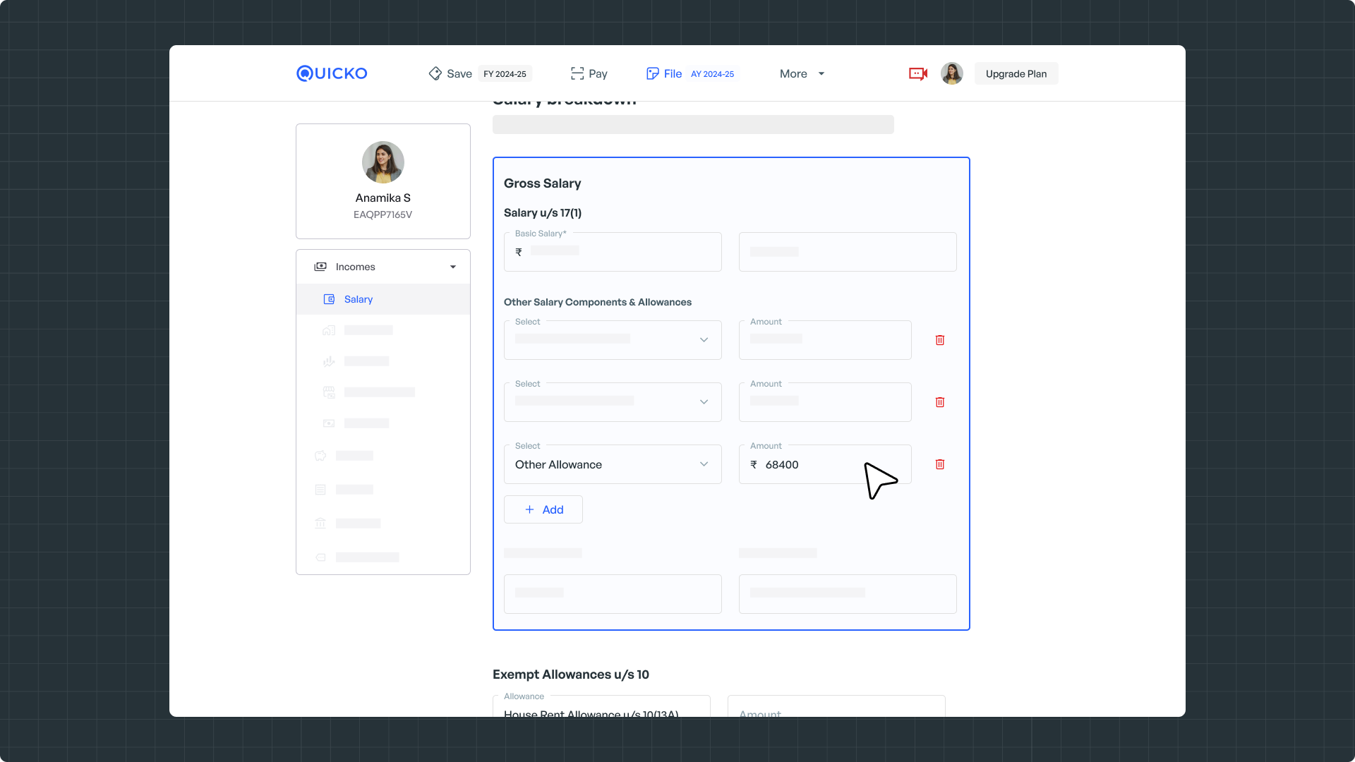 - Enter HRA, LTA and any other specific allowance in their dedicated fields, if available.