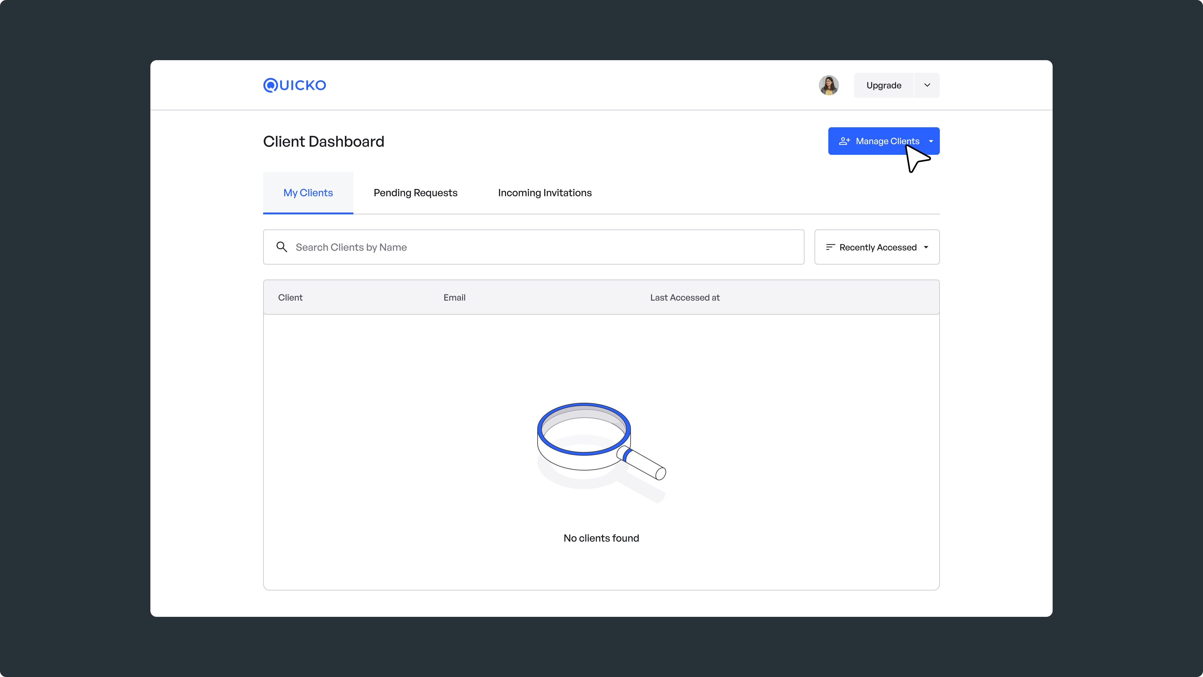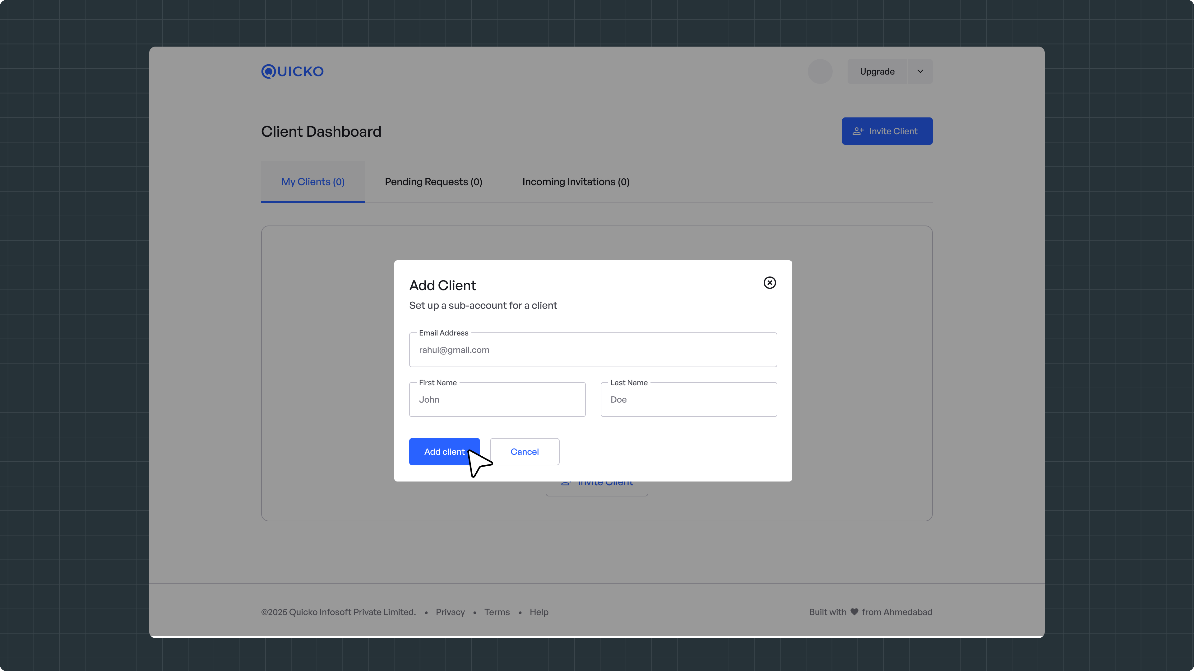 If your client already has a Quicko account, you can invite them instead — see How to invite a client with a Quicko account.
