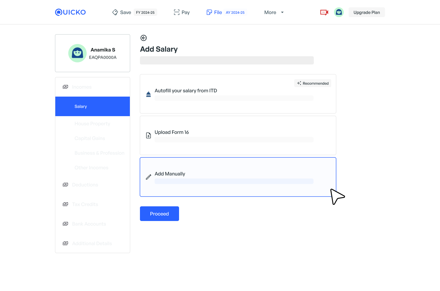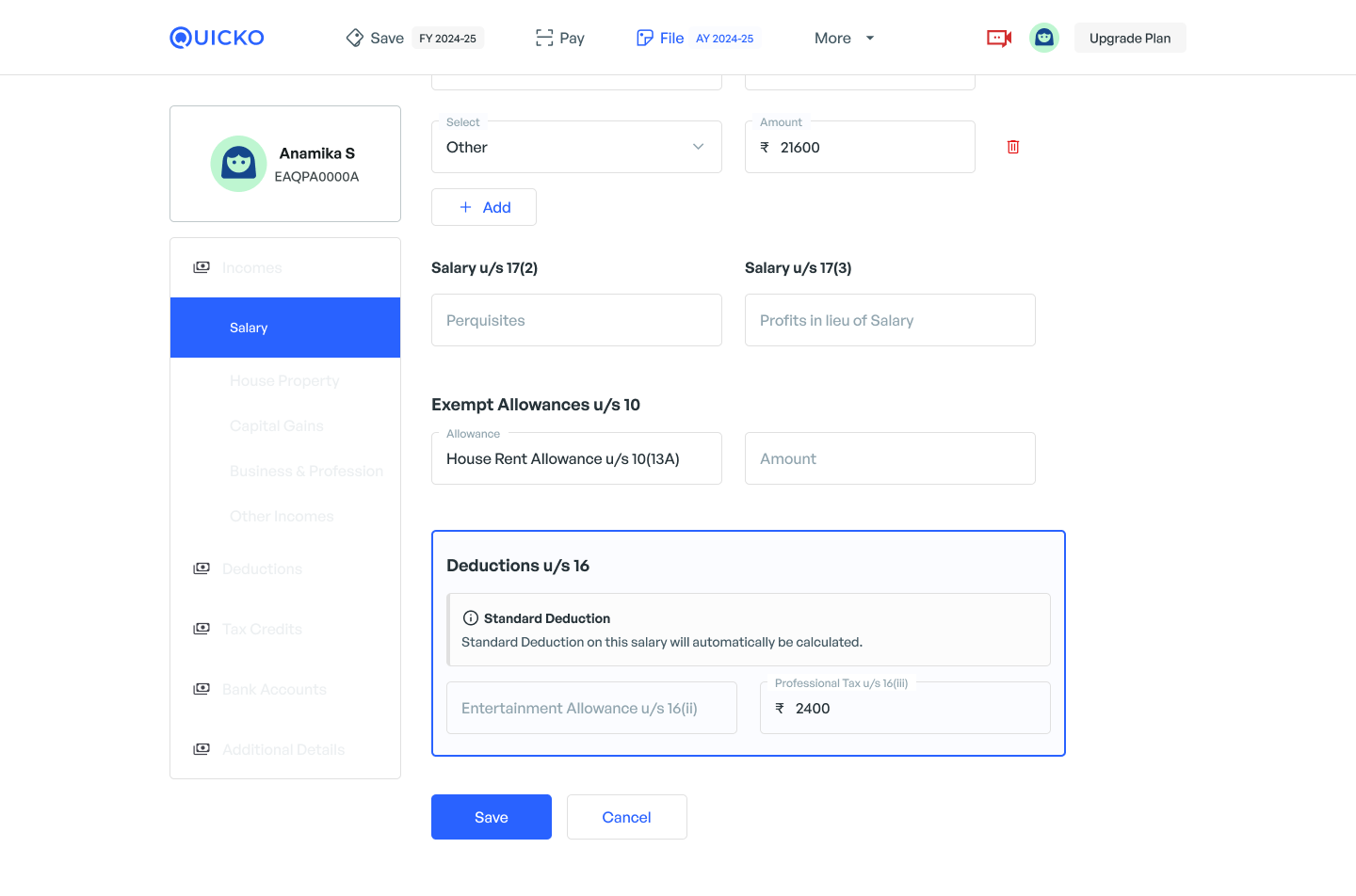 You can auto-fill your salary from the Income Tax Department if your employer has deducted TDS and generated a Form 16. Details such as salary breakdown, including deductions, exemptions, and allowances will be imported. Even if TDS doesn’t apply to ...