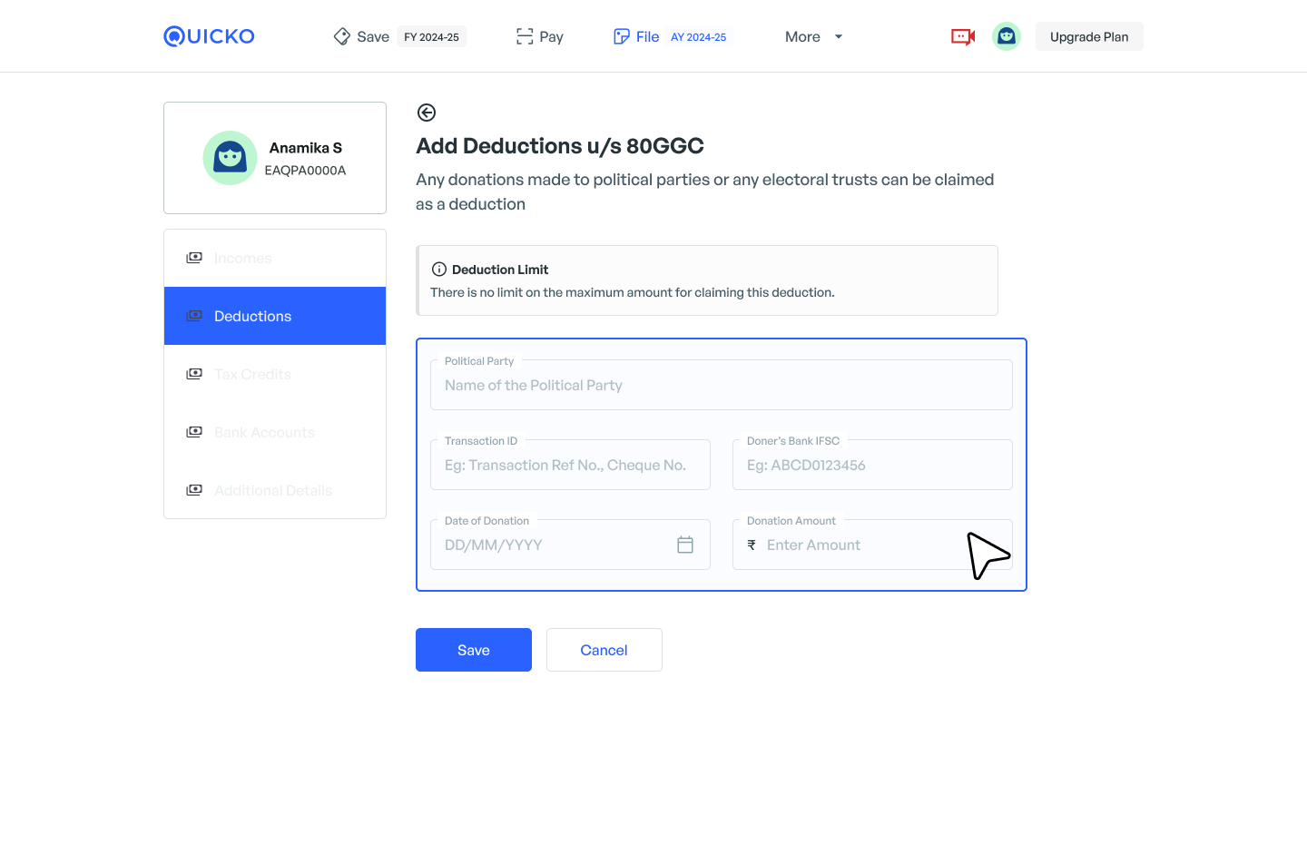 Enter the required details i.e Political party name, transaction ID, the amount paid during the year