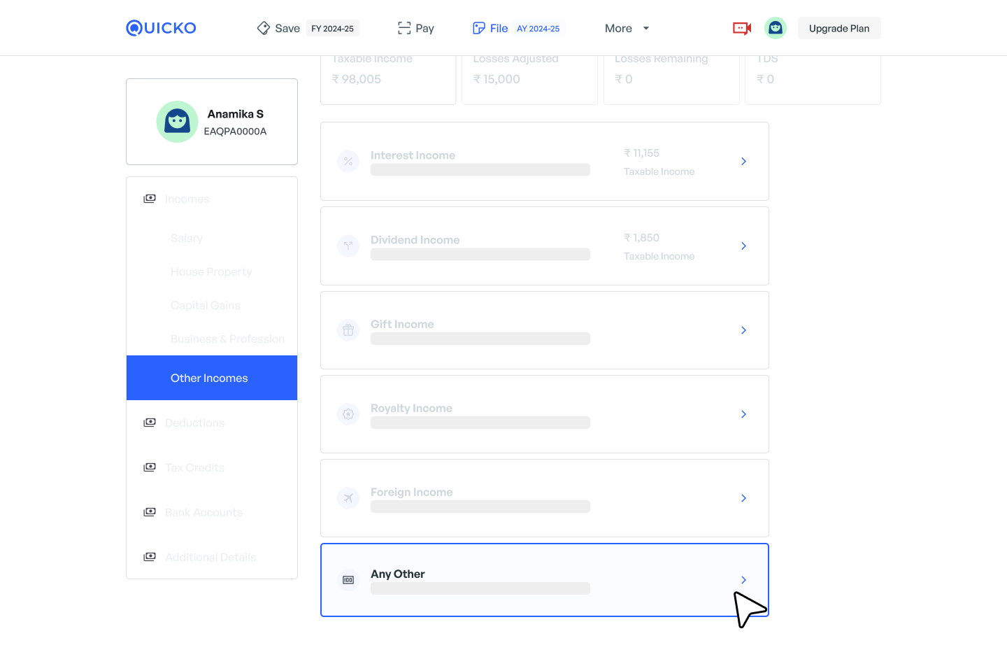 Gifts received from relatives are completely exempt from income tax. Keep reading to find how to disclose them accurately in your ITR to avoid any taxation. Steps to add gift income from relatives: 1. Navigate to File > Incomes > Other Incomes, then ...