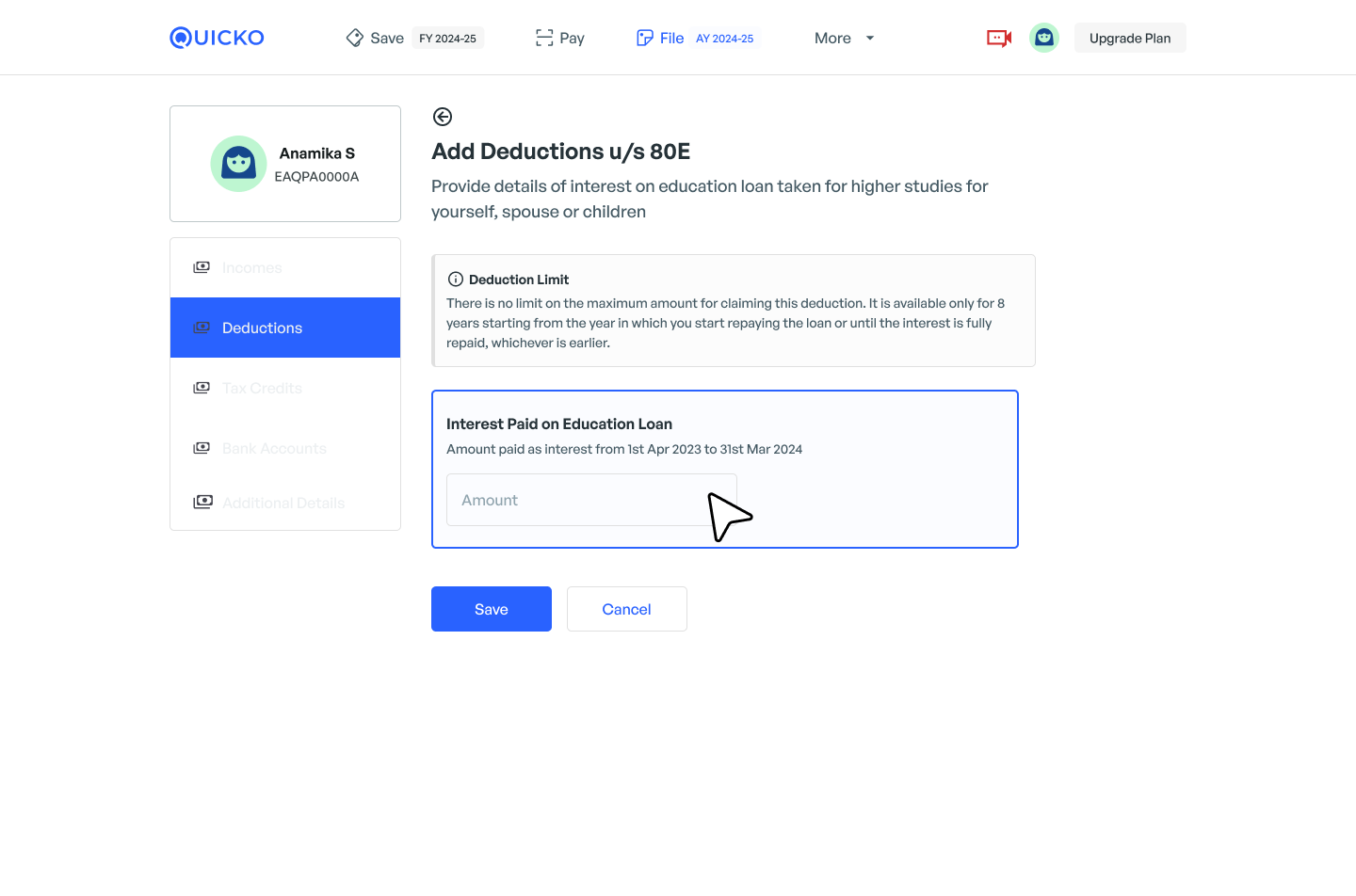 Section 80TTA allows you to claim a deduction on the interest earned from savings accounts held with banks, post offices, or cooperative societies. Note: This deduction does not apply to interest from fixed deposits (FDs) or recurring deposits (RDs). ...