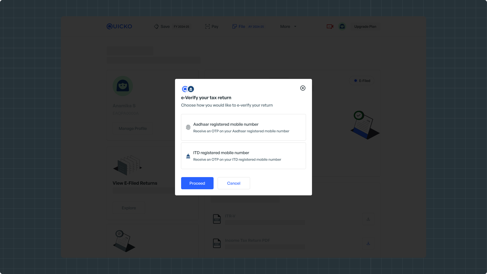 Choose your preferred method for e-verifying — Aadhaar OTP or ITD registered mobile number