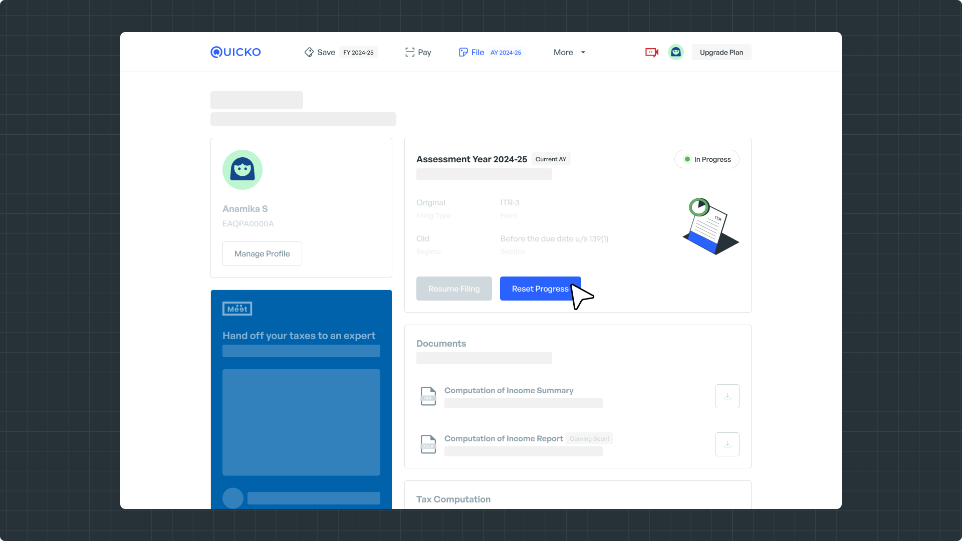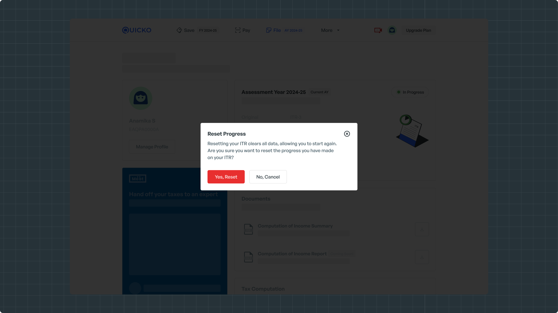 Note: Resetting your ITR on Quicko won’t affect the ITR prepared or filed on your income tax portal.