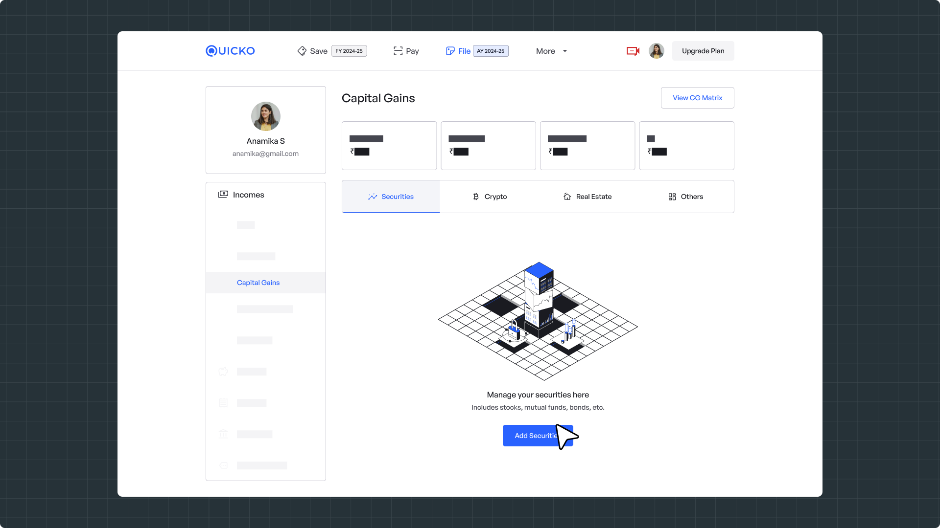 - Securities (Stocks, Mutual Funds, ETFs, Bonds, Debentures)